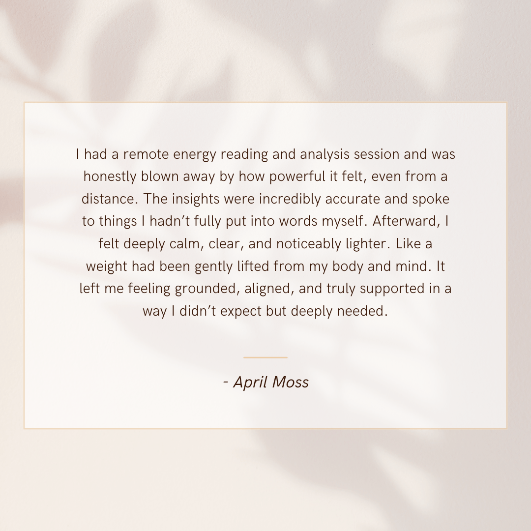 This offering is a subtle, observational practice that invites awareness into how your energy currently moves, holds, and communicates within the body. Through a remote intuitive lens, I attune to your field to observe qualities such as color, patterns of flow, density, and expression - noticing how energy travels through the body and where it gathers, softens, pauses, or transitions. At the end of each session I work on harmonizing your energy to help different parts of your system communicate more smoothly, and soften areas that were holding tension to support a natural sense of balance, safety, and flow.